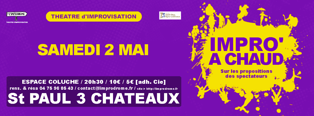 Samedi 3 mai, 20h30, Espace Coluche à St Paul-3-Châteaux, 10€ ou 5€, renseignement et réservations contact@limprodrome.fr ou 04 75 96 85 43